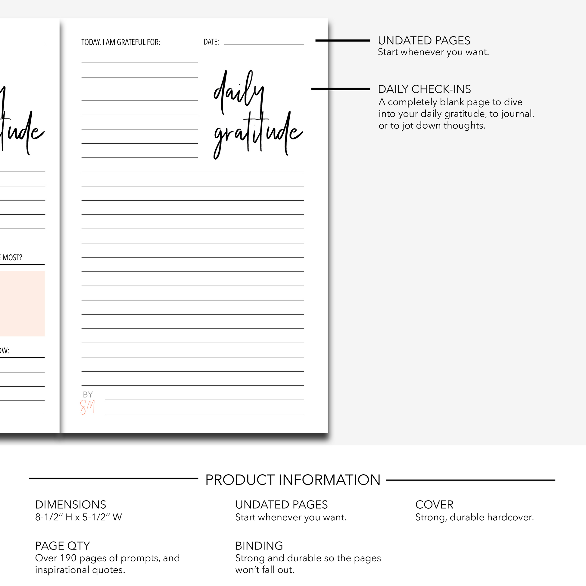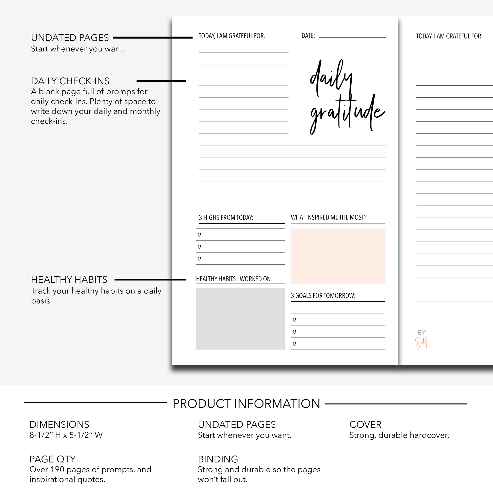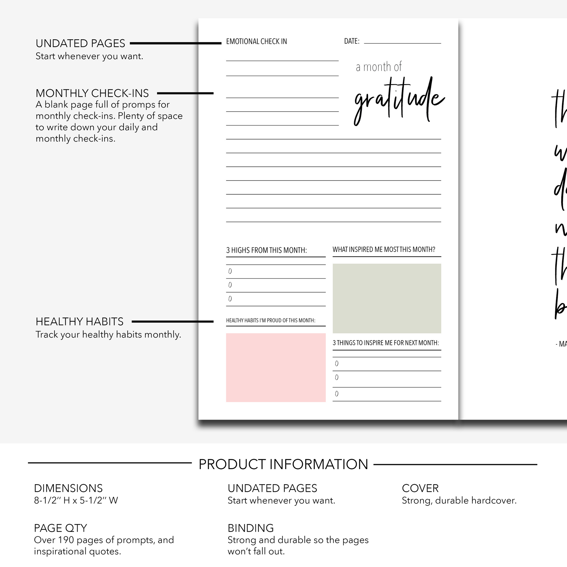 Cultivate daily gratitude and form healthy habits with the Daily Gratitude Journal. This undated journal features a perfect balance of guided gratitude pages and blank pages for you to fill in with all the things that bring joy to your daily life. Use the guided wrap-up pages to look back at your month and stay inspired for the month ahead. You can even use the pages for both morning or evening practice or turn to the guided pages when you're struggling to get the words flowing. This journal is a perfect tool to focus on a mindful gratitude practice that will bring major positive effects in your life. Get it now either on bysamanthamarch.com or Amazon and start your gratitude journey today!