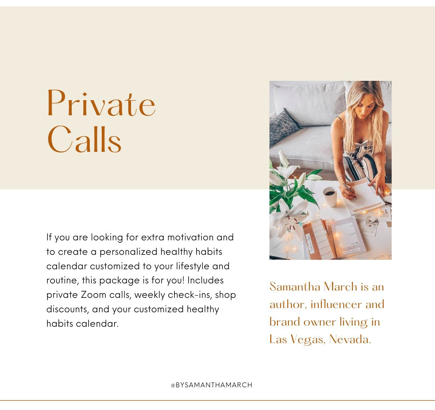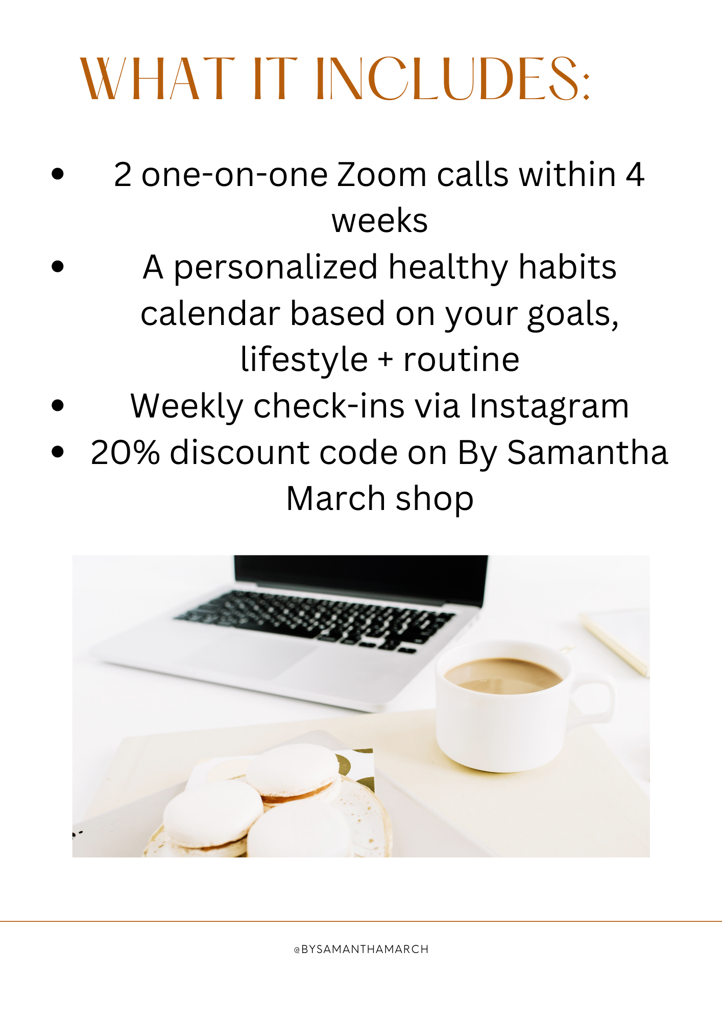 If you are looking to create a personalized healthy habits calendar but aren't sure how to make your own, this is for you! This package includes 2, thirty minute one-on-one Zoom calls with Samantha to discuss your goals, routines, and lifestyle, weekly check ins, and a 20% off discount code on the By Samantha March shop. Samantha will work with you to create your customized healthy habits calendar and help keep you motivated to stick to your goals and new routine. This is a 4 week package and can begin when best works for your schedule.